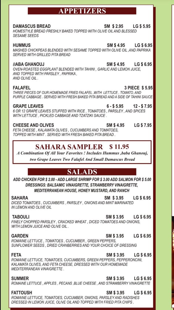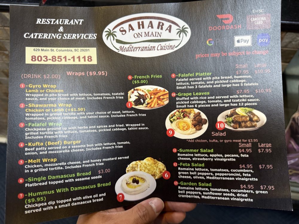 Welcome to Sahara On Main, your premier destination for authentic Mediterranean cuisine in Columbia, SC. Nestled on Main Street, this eatery offers a variety of delectable dishes that marry flavor and tradition. Customers rave about the generous portions and the warm, family-like atmosphere cultivated by a passionate owner who is deeply involved in the kitchen.